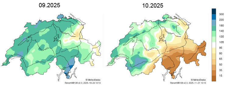 Il mese di settembre è stato piuttosto umido con precipitazioni superiori alla media. Soltanto in alcune regioni della Svizzera orientale si sono registrate precipitazioni lievemente inferiori al periodo di riferimento 1991–2020. La prima metà del mese di ottobre è stata caratterizzata da alta pressione stabile con tempo asciutto. Dal 20 ottobre si è instaurato un tempo variabile caratterizzato da venti occidentali che fino alla fine del mese hanno causato ripetute precipitazioni in Svizzera. Di conseguenza, nel Giura, nel Basso Vallese, nell’Altopiano occidentale e nella Svizzera settentrionale si sono registrate precipitazioni leggermente superiori alla media rispetto al periodo di riferimento. Ad altitudini più elevate (a partire da circa 1600 m s.l.m.) si sono verificate nevicate. A Sud delle Alpi e in vaste aree dei Grigioni, invece, anche nella seconda metà di ottobre si sono registrate poche precipitazioni. In queste zone le precipitazioni mensili sono nettamente al di sotto della media. Novembre è iniziato con la pioggia ed è continuato con un periodo di alta pressione e tempo asciutto.