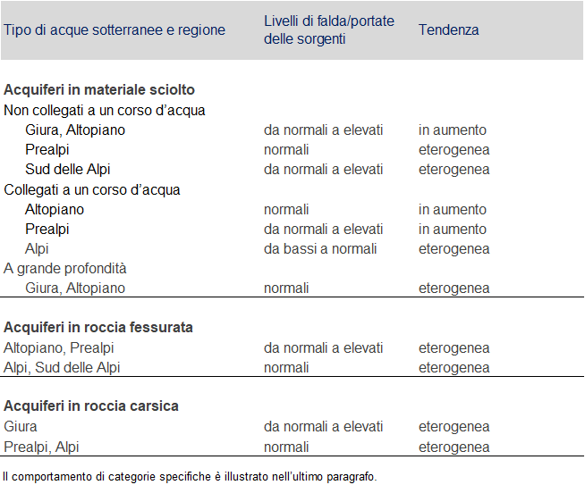 - Al Sud delle Alpi gli acquiferi in materiale sciolto raggiungono il livello più basso delle acque sotterranee generalmente a febbraio/marzo e due livelli massimi, rispettivamente a maggio/giugno e a ottobre (regime pluvio-nivale).