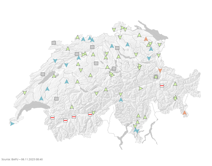 Nel Giura e nell’Altopiano i livelli di falda e le portate delle sorgenti risultano nella norma o elevati. A causa delle precipitazioni delle ultime due settimane, in queste zone la tendenza è perlopiù al rialzo. Nelle Alpi e nelle Prealpi i livelli di falda e le portate delle sorgenti risultano nella norma, con una tendenza disomogenea. A Sud delle Alpi i livelli di falda e le portate delle sorgenti restano da normali a elevati a causa delle abbondanti precipitazioni di settembre.